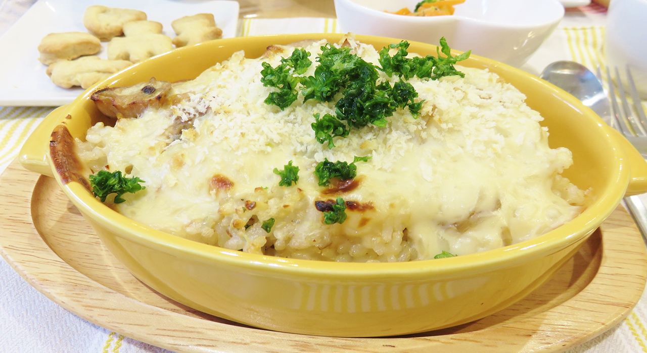 玄米ご飯にみじん切りにしたパセリと粗みじん切りにしたナッツ、白こしょうを混ぜ合わせ、グラタン皿に敷き詰め具を並べホワイトソース、パン粉をかけて220℃に予熱したオーブンで10分焼成する。取り出してパセリをトッピングする。