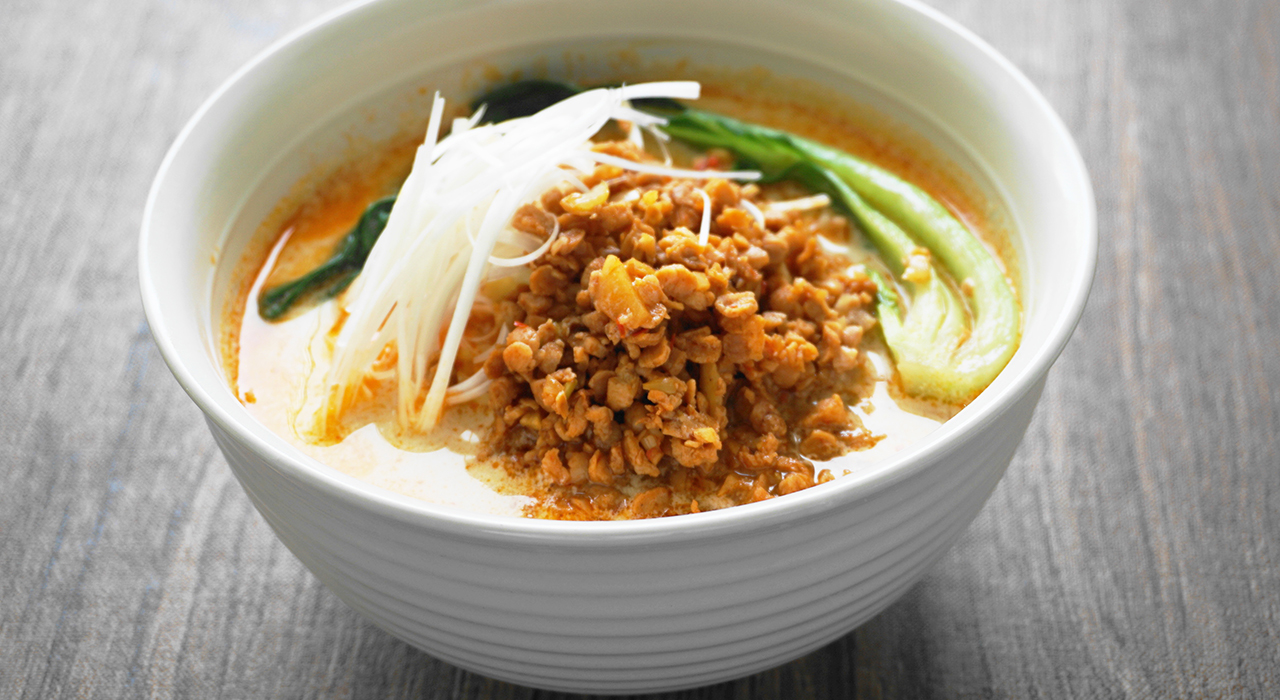 ⑤ 器に担担麺スープを入れ合わせて温めた水とアーモンドミルクを加えて混ぜる。