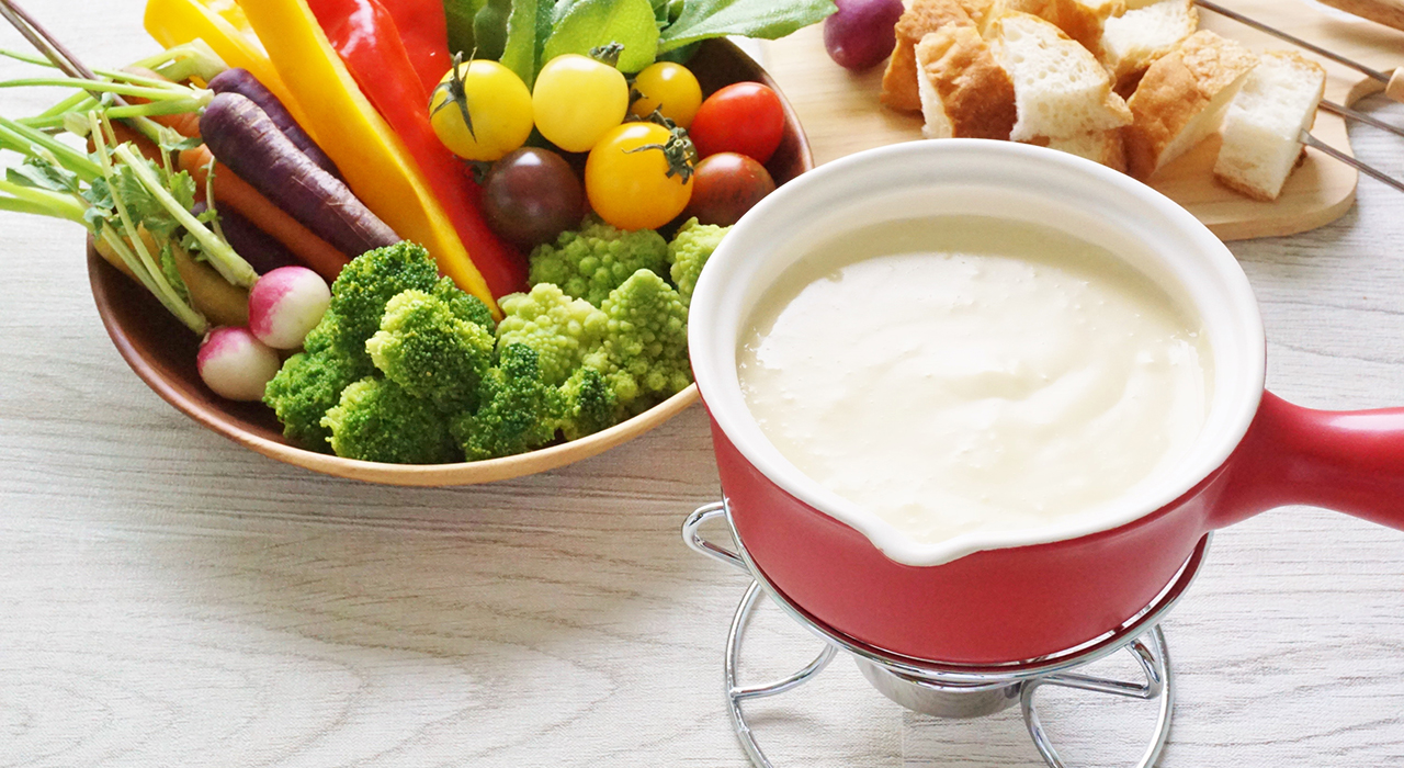① フォンデュ鍋に白ワインを入れ火にかけアルコールをとばす。 ② ヴィーガンシュレッドにコーンスターチをまぶして①に加える。 ③ アーモンドミルクと野菜ブイヨンを加えて溶けるまで撹拌しながら加熱する。