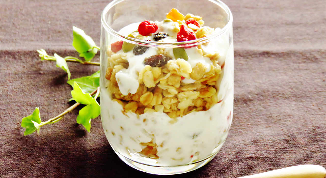 ① 器に入れたグラノーラにアーモンドミルクをかける。
