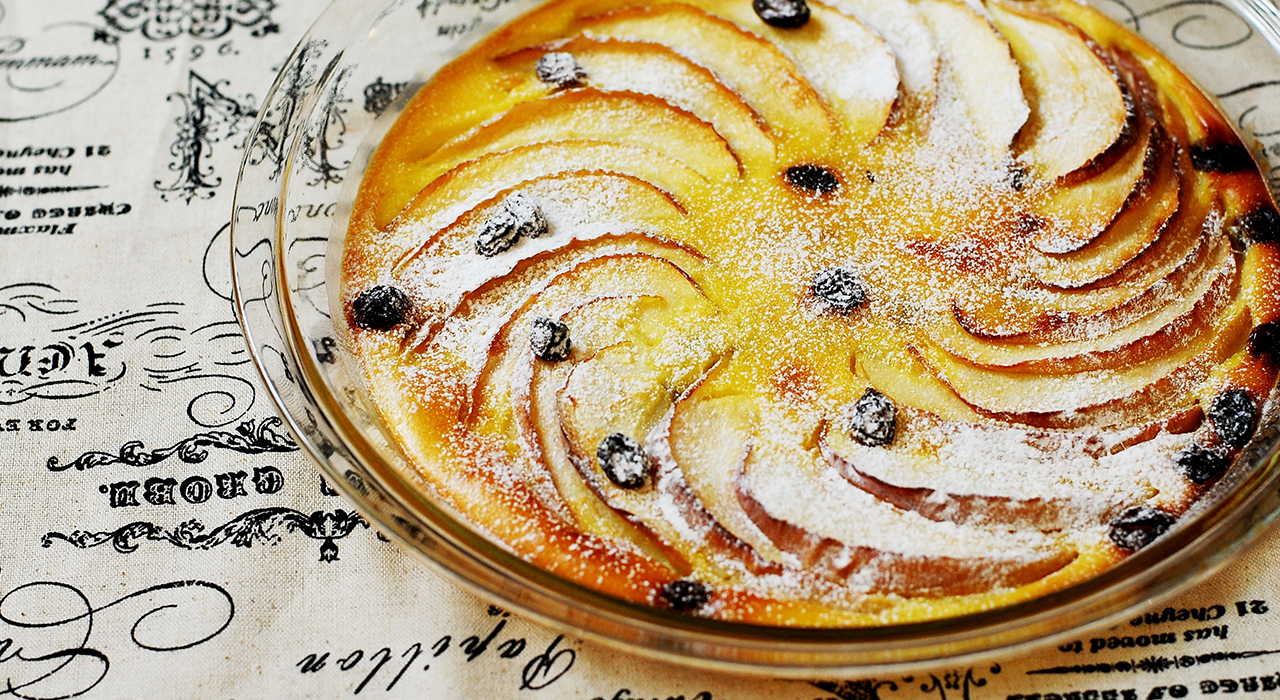② 耐熱容器にりんごを並べ、レーズンを散りばめ、①を流し入れる。
