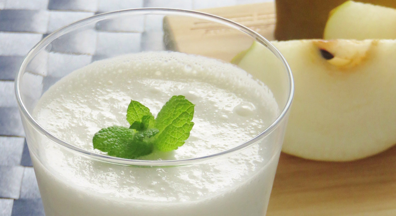 ① 洋ナシはカットして皮を剥き一口大に切る。 ② ①と他の材料をミキサーに入れて滑らかになるまでかける。 ③ 器に注ぐ。