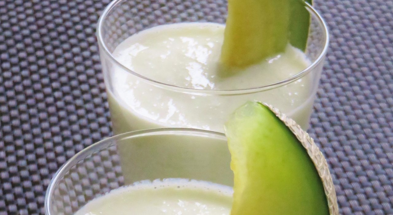 ① メロンは半分に切って種を取り飾り用の部分を残して果肉をスプーンですくっておく。 ② 果肉とアーモンドミルクをミキサーに入れて滑らかになるまでかける。 ③ グラスに注ぎ飾り用のメロンをふちに飾る。