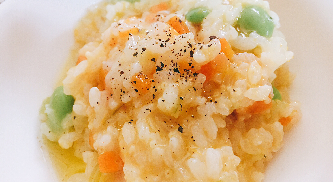 ⑦ 蓋を開けてかぼちゃと枝豆を加え混ぜ合わせる。自然塩で味を整え器に盛りオリーブ油を回しかけ黒胡椒を中央に振る。