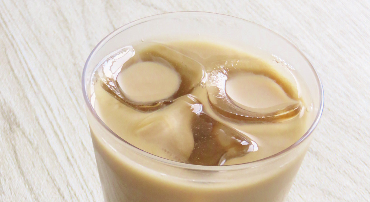 ① グラスに氷を入れて濃いアーモンドミルクを注ぐ。 ② アイスコーヒーを加える。