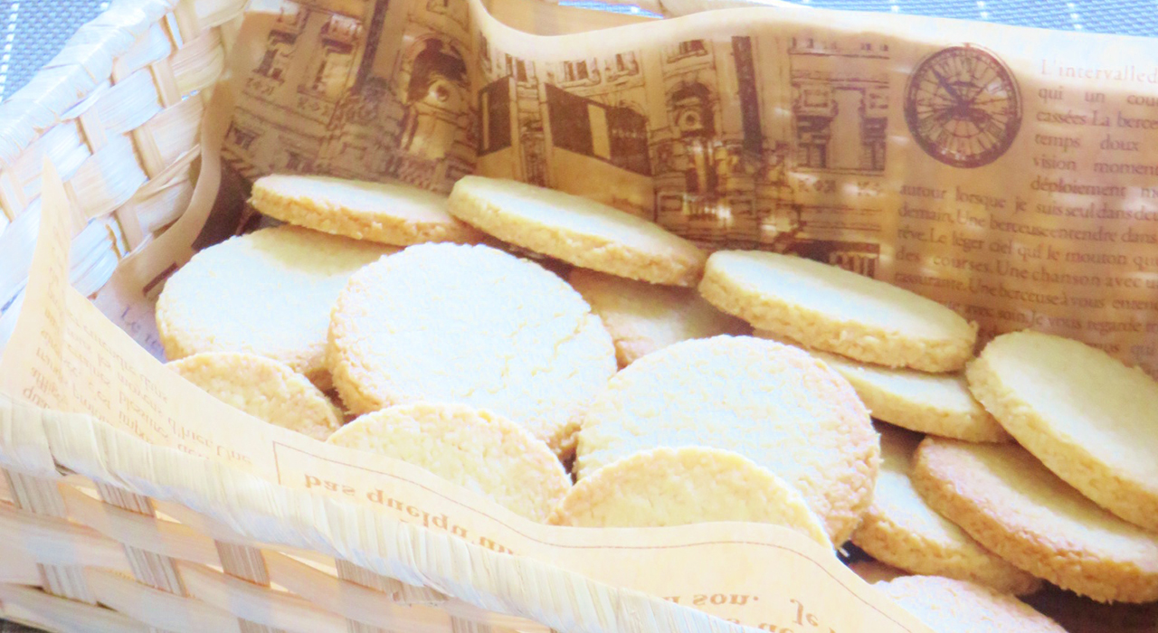 ① 粉類を合わせるて粉体混合しておく。 ② 溶かしたバターとアーモンドミルクを加えて混ぜ合わせる。 ③ 3mmの厚さに伸ばして型で抜き天板に並べる。 ④ 予熱したオーブンで180℃15分焼成する。